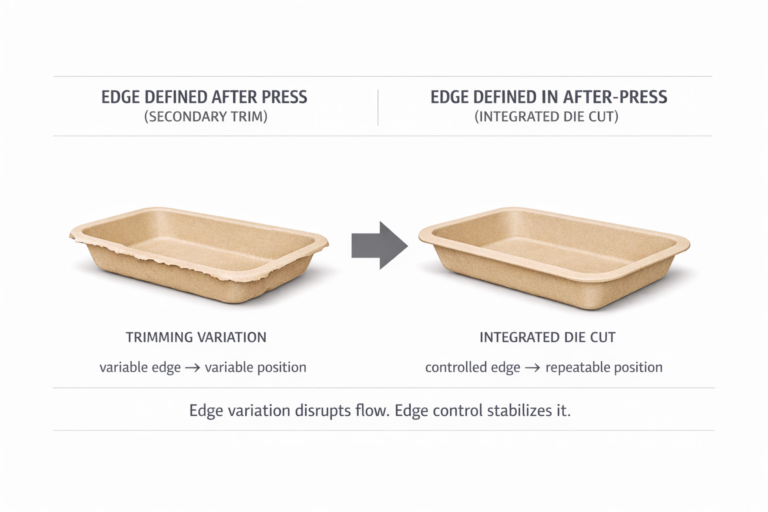 In molded fiber parts where the edge is defined after the part has been pressed, trimming is often the primary source of variability.